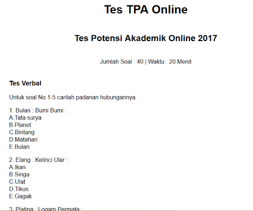 Pelajari contoh soal tpa untuk tes masuk ptn akpol akmil download contoh soal tes akademik polri, contoh soal tpa untuk tes masuk ptn akpol akmil 2019 kumpulan soal dan pembahasan kunci jawaban latihan masuk akpol akmil download kumpulan contoh soal tpa stan 2019 gratis terbaru contoh soal tes potensi akademik usm stan dan sbmptn pada tulisan. 13. soal latihan tpa (prediksi 14. soal undang undang kepolisian (prediksi tes 2017) 15. soal tes akpol paket 1 (tes asli 2011)>180 soal 16. soal tes akpol paket 2 (tes asli 2012)--> 180 soal 17. soal tes akpol paket 3 (tes asli 2013)--> 180 soal 18. soal tes akpol paket 4 (tes asli 2014)-> 200 soal 19. soal tes akpol paket 5 (tes asli 2015. Soal tes potensi akademik polri berbeda untuk tiap tingkatannya akpol, sipss, brigadir. untuk tamtama tidak ada tes potensi akademik polri. tes akademik biasanya berlangsung 2 sampai 3 hari. tes ini biasanya adalah tes paling sulit menurut para calon siswa. dalam tes akademik hampir lebih dari 50% dari peserta tes akademik gagal. Bimbel privat surabaya 0878. 9797. 4400 (wa) bimbel privat terbaik di surabaya, guru privat surabaya, cari guru privat, les privat bahasa inggris, les privat matematika, les privat tes potensi akademik (tpa) sbmptn-tni polri-bumn-cpns-ppds-pkn stan.
